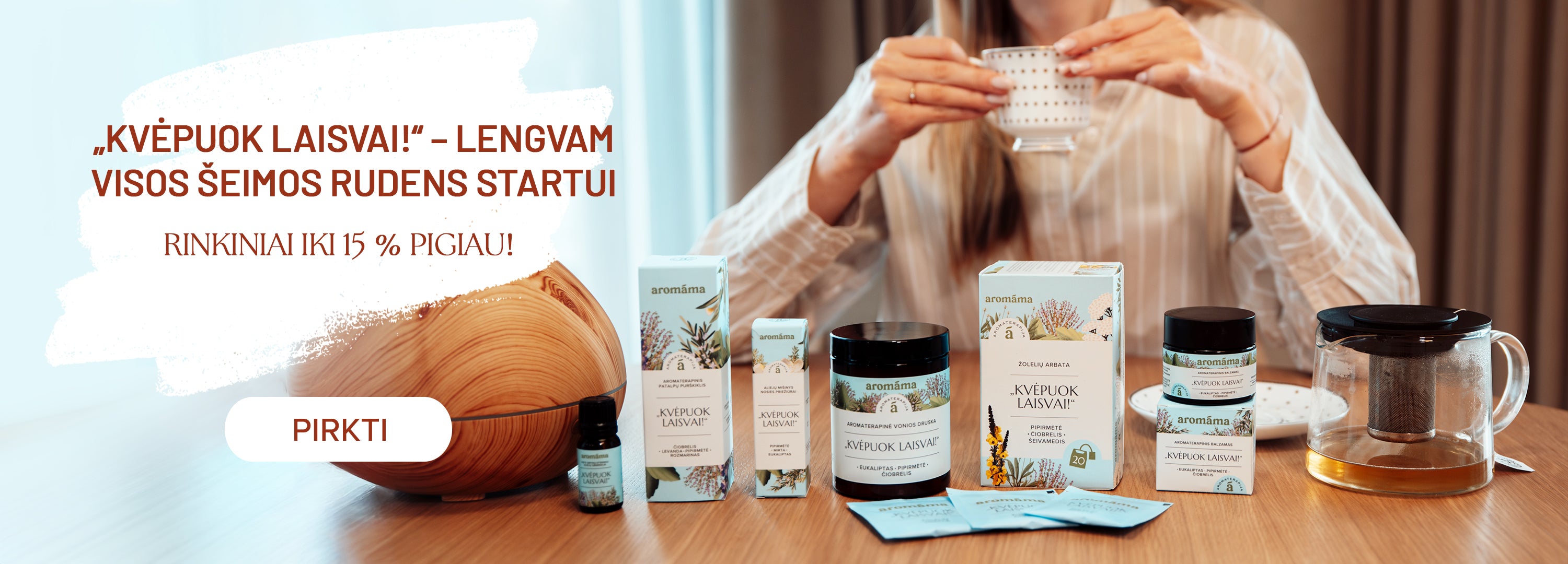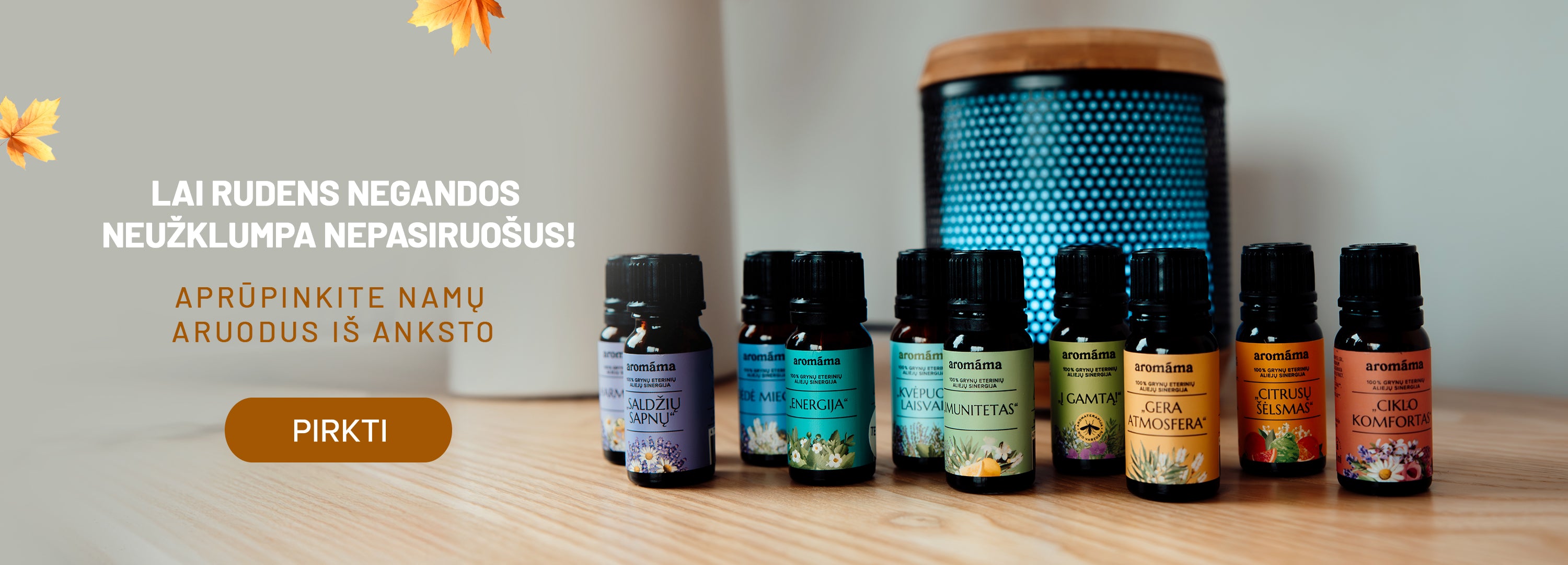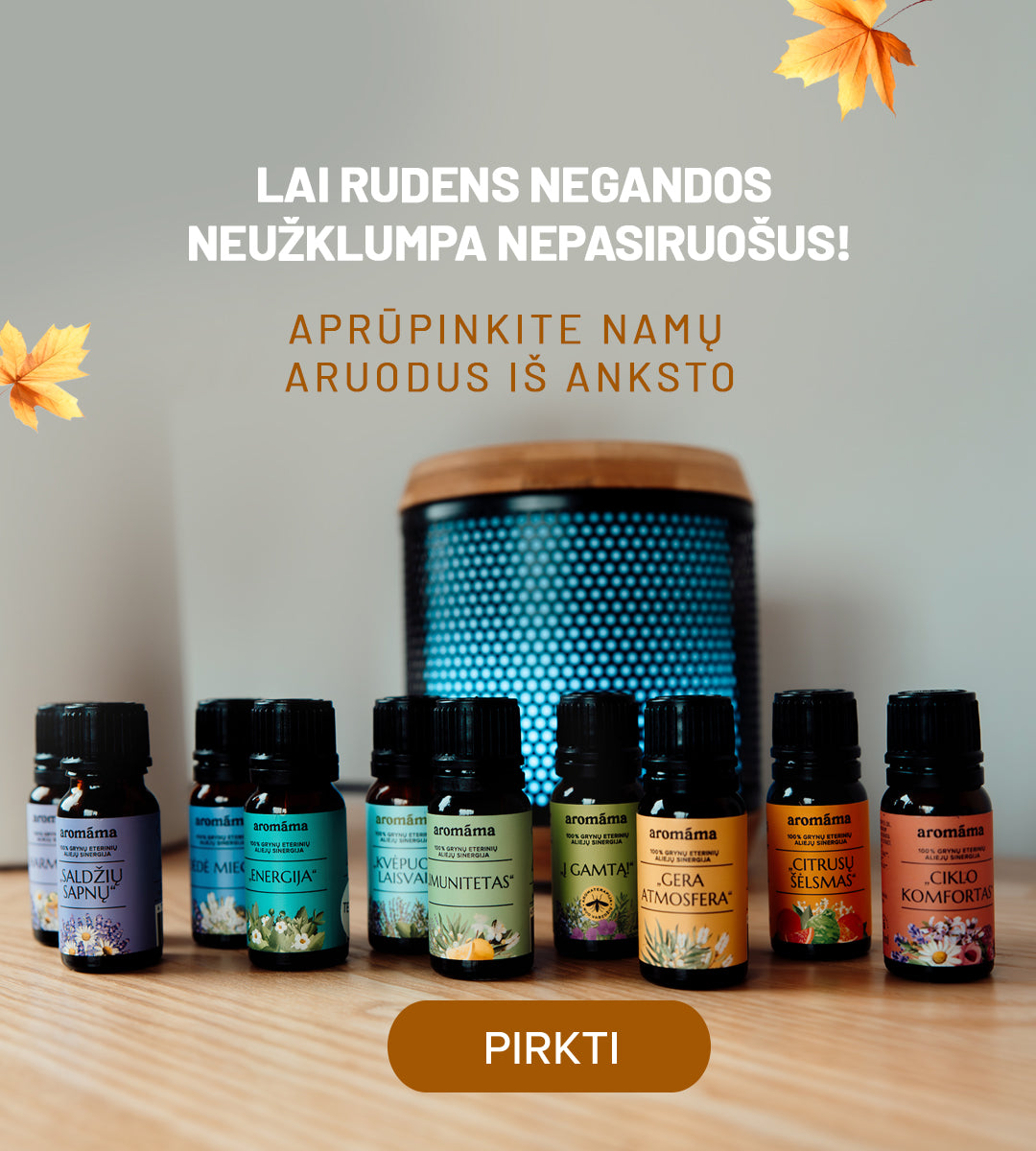 Tai gamtos perėjimas į šaltąjį sezoną: augalai ruošiasi ramybės laikui, lapai keičia spalvą, gyvūnai kaupia atsargas. Energija tolydžio rimsta, žmogaus dėmesys natūraliai krypsta į žemę ir vidinį gylį. Ruduo kviečia iš išorės į vidų – tiek tiesiogine, tiek perkeltine prasme. Ilgėjantys vakarai ir vis drąsiau į langus besibeldžianti tamsa skatina sulėtėti ir uždegti šviesą bei jaukumą savo namuose – tiek širdyje, tiek po tikrųjų namų stogu. Rudėjant kviečiame pasirūpinti savimi: sušildyti kūną ir sielą žolelių arbatomis, pripildyti namus eterinių aliejų aromatų, dažniau pasilepinti namų SPA. Leiskite aromáma būti jūsų rudens drauge, palydinčia į vidinę tylą ir malonius kasdienius savirūpos ritualus.